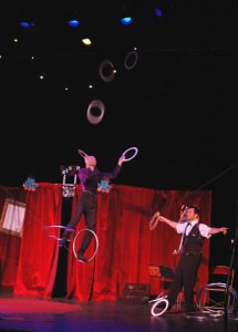 pour jeune public qui s’ouvre sur la musique de Kander et Ebb ne peut que remporter l’adhésion de Regard en coulisse. Le Cabaret loufoque est un court et sympathique spectacle qui mêle cabaret et cirque. Tours de magie, acrobaties, musique, jonglage, équilibrisme… Telles sont les disciplines qu’un dandy sérieux et un barman maladroit utilisent pour se livrer à un duel déjanté. Il y a du rythme, il y a de l’énergie et il y a surtout beaucoup de talent même si les jeunes spectateurs n’en ont sans doute pas conscience. Ils sont plutôt sensibles à l’aspect affrontement entre le dandy-clown blanc et le barman-Auguste. Le Cabaret loufoque est donc un spectacle pour enfants de bonne facture qui, avec peu de moyens mais une bonne dose de talent, initie les petits à l’univers du cirque.