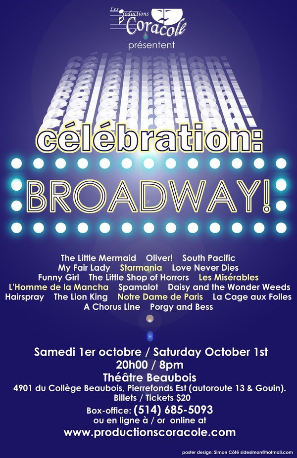Les Productions Coracole sont heureuses et fières de présenter Célébration : Broadway !, un spectacle style cabaret rempli d’extraits autant en français qu’en anglais de comédies musicales des plus populaires (The Little Mermaid, Les Misérables, Haisrpray, Starmania) ou celles à découvrir (Daisy and the Wonder Weeds) !