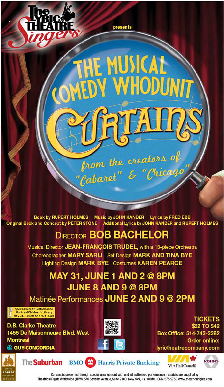 C’est dans un théâtre fraîchement rénové que les « Lyric Theatre Singers » — une troupe de plus de quarante interprètes et un orchestre de treize musiciens — ont offert leur première production avec livret au lieu de leur traditionnel « concert ». Leur choix s’est arrêté sur Curtains, la création de Rupert Holmes (livret), Fred Ebb (paroles) et John Kander (musique) : un choix judicieux pour cette troupe. La comédie musicale Curtains, peu connue du public québécois, offre une diversité du côté musical et mérite d’être découverte.
