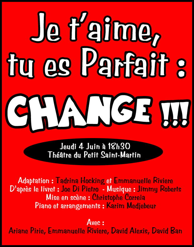 Nous avons présenté Je t’aime, tu es parfait… Change !!! pour la première fois au Théâtre du Petit Saint-Martin en 2009, lors des Découvertes Diva, puis ensuite à La Pépinière Opéra en 2010, toujours sous forme de lecture. Il y a eu un tel engouement du public et des professionnels, que tout s’est enchaîné très vite.