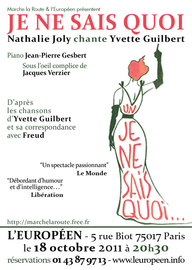 Freud et Yvette Guilbert… Deux personnalités que l’on ne pense pas forcément à rapprocher l’une de l’autre. Et pourtant le père de la psychanalyse s’est pris de passion pour la chanteuse réaliste, jusqu’à entretenir une correspondance avec elle. C’est sur ce principe que le spectacle est construit. Nathalie Joly incarne une Yvette Guilbert au charme suranné et à la voix assurée (sans pour autant égaler le timbre incroyable de l’originale). Au piano Jean-Pierre Gesbert commente, enrichit le propos.