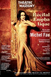 Notre avis : Créé en décembre 2011 aux Bouffes du Nord ce spectacle emphatique, soit « ampoulé, déclamatoire, enflé, grandiloquent, pompeux », pour reprendre la définition du Petit Robert, stimule avec une belle efficacité les zygomatiques. Michel Fau, peut-être inspiré par des personnages comme Florence Foster Jenkins et d’autres cant-actrices de tout poil, offre en quelques tableaux un savoureux digest du meilleur du pire. Et pour tenir ainsi les différents personnages, il en faut du talent ! Un simple mouvement de main, un cil qui bat et l’autre pas, des postures chorégraphiques complexes (surtout avec une robe composée de multiples voiles)… et la salle qui se gondole de rire. Bref, le comédien travesti se régale à nous amuser avec ces pastiches irrésistibles, accompagné par un pianiste qui, lui, ne plaisante pas avec la mesure, l’épatant Mathieu El Fassi. Et pour que l’emphase soit totale, l’artiste ne se dissimule derrière aucun artifice : pas de dramaturgie, juste le plaisir d’enchaîner des numéros qui laissent au spectateur à peine le temps de reprendre sa respiration. Décalé, vraiment drôle et libre, à l’image du comédien metteur en scène. Chaleureusement recommandé !