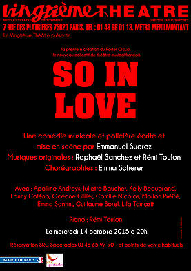 Écrite et mise en scène par Emmanuel Suarez (vu notamment dans Avenue Q), ce spectacle est une véritable pièce de théâtre, agrémentée de chansons originales et de numéros musicaux, un hommage tout en suspense aux grandes comédies musicales hollywoodiennes et au cinéma des années 40. Entre créations musicales françaises avec des mélodies signées Raphaël Sanchez et Rémi Toulon, et versions arrangées des standards de Cole Porter, Irving Berlin ou George Gershwin, So in Love pourrait se résumer ainsi : un meurtre, neuf femmes et autant de suspects…